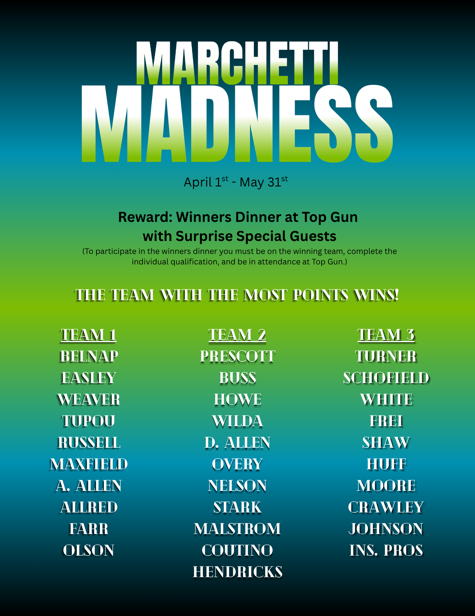 - Each person on the winning team must be present at Top Gun, and qualify as an individual to participate in the team award.